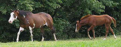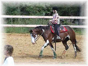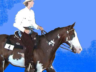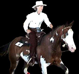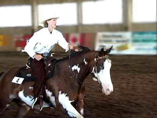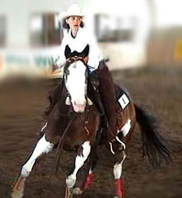 Pretty ist 3jaehrig sozusagen frisch aus den Staaten zu uns gekommen . Wir kauften sie bei einem Pferdehaendler bei Nuernberg ! Pretty ist schon immer ein sozusagen lustiges Kerlchen (Maedchen ) gewesen . Sie hupft im Padock wie ein Geisbock rum und hat bei uns den Spitznamen " alter Gockel " ! Ein Brueller und sie macht einen Rollback auf den Hintern - das schafft sie sogar hochtragend ! Sie ist ein Ranchhorse , wie aus dem Lehrbuch - unwahrscheinlich wendig , dynamische Rollbacks , tiefe Stopps , genial am Rind , souveraen und ruhig abwartend in der Cowhorse , immer in der richtigen Position bleibend ! Im Gelaende scheufrei , ausser natuerlich der Fruehling juckt ! Ein tolles vorsichtiges Kinderpferd , sehr rittig und eine unkomplizierte Mama . Ich war mit ihr nur zwei mal auf einem Turnier - dort holten wir uns zwei Meistertitel - in Reining Amateur und in Barrelrace Amateur . Sie wird jetzt nur noch in der Zucht oder zum ausreiten genutzt , da ich mich auf die Hengste konzentrieren muss . Pretty wurde verkauft wegen Zuchtumstellung Anfang 2005 - sie hatte mir über die Vaterseite zu viel Pleasureblut und als Overo war sie mir zu gefährlich in der Anpaarung mit einem reinerbigen Tobiano (ich sag nur weisses Pferd mit braunem Ohr)