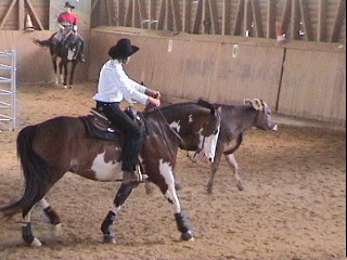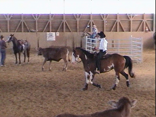 hier noch ein paar Bilder von einem Playday Mai 2003 - ich hatte an dem Wochenende mit Charlie einen Rinderkurs mit anschliesendem Playday und da an dem Tag ein Pferd ausfiel , zerrte ich die dicke , voellig untrainierte Mama mit dem 1 1/2 Monate alten Fohlen von der Weide , fuhr hin , Fohlen in eine Box , Sattel rauf und Pretty machte souveraen ihren Job und durfte dann wieder zurueck ! Das nenne ich Westernpferd !!!!