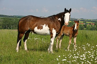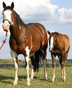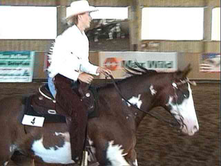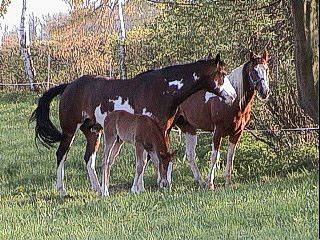 Pretty ist 3jaehrig sozusagen frisch aus den Staaten zu uns gekommen . Wir kauften sie bei einem Pferdehaendler bei Nuernberg ! Pretty ist schon immer ein sozusagen lustiges Kerlchen (Maedchen ) gewesen . Sie hupft im Padock wie ein Geisbock rum und hat bei uns den Spitznamen " alter Gockel " ! Ein Brueller und sie macht einen Rollback auf den Hintern - das schafft sie sogar hochtragend ! Sie ist ein Ranchhorse , wie aus dem Lehrbuch - unwahrscheinlich wendig , dynamische Rollbacks , tiefe Stopps , genial am Rind , souveraen und ruhig abwartend in der Cowhorse , immer in der richtigen Position bleibend ! Im Gelaende scheufrei , ausser natuerlich der Fruehling juckt ! Ein tolles vorsichtiges Kinderpferd , sehr rittig und eine unkomplizierte Mama . Ich war mit ihr nur zwei mal auf einem Turnier - dort holten wir uns zwei Meistertitel - in Reining Amateur und in Barrelrace Amateur . Sie wird jetzt nur noch in der Zucht oder zum ausreiten genutzt , da ich mich auf die Hengste konzentrieren muss . Pretty wurde verkauft wegen Zuchtumstellung Anfang 2005 - sie hatte mir über die Vaterseite zu viel Pleasureblut und als Overo war sie mir zu gefährlich in der Anpaarung mit einem reinerbigen Tobiano (ich sag nur weisses Pferd mit braunem Ohr)