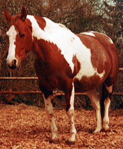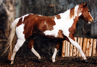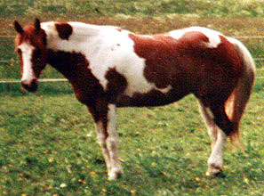 Hier moechte ich nun doch noch unsere allererste Zuchtstute vorstellen . Sie hat ein Denkmal verdient ... Skippy wurde Ende 1998 von uns gekauft , um mit Pretty zusammen unsere kleine Zucht zu gruenden . Uns war es leider nicht vergoennt aus dieser wunderbaren original Wiescampstute mehr als zwei Fohlen zu ziehen . Sie hatte eine Knochenwucherung am Karpalgelenk , die ihrer Zuchtkarriere und ihrem Leben schon im Alter von 9 Jahren ein Ende setzte . Wir werden sie nie vergessen ! Leider hatte ich zu der Zeit noch keine Digitalkamera (hab sie einfach vom Foto abfotografiert) :